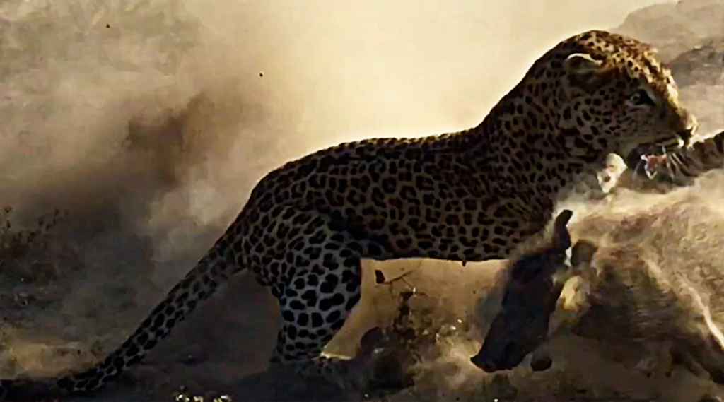 Moments before it struck, the big cat was right behind the entrance to the warthogs’ den, completely unbeknownst to the hogs.