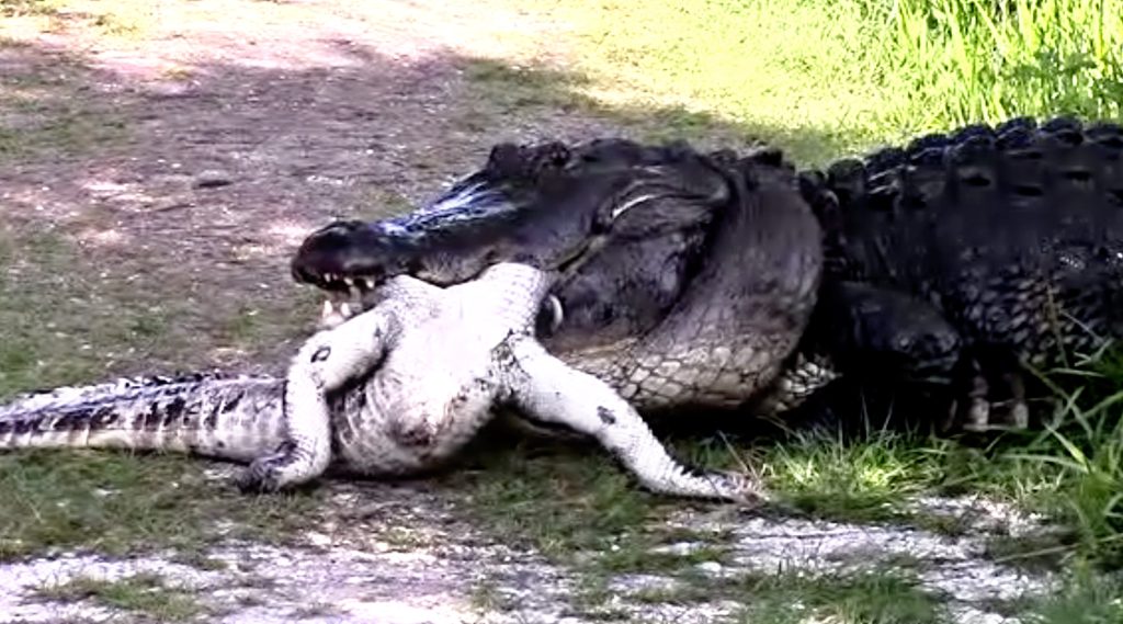 The gator can be seen shaking and chewing the smaller reptile, a method they use to break the bones of their prey to make it easier to swallow and digest.