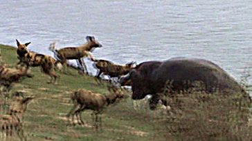 Wild Dogs Provoke Angry Hippo
