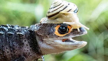 A crocodile skink makes a fashion statement with a snail hat! A photographer has captured a hilarious snap of a crocodile skink appearing to wear a snail as a hat. More