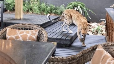 This incredible video captures the intense moment a leopard entered a lodge’s restaurant, and walked amongst the guests in pursuit of a large antelope it had been stalking. More