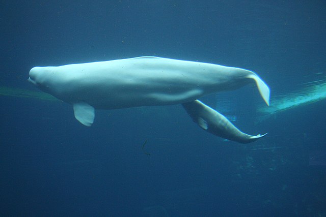 Belugas and narwhales are medium-sized toothed whales, and are the only living members of the Monodontidae family. The two species are estimated to have diverged approximately 5 million years ago. They’re very similar in size and share many characteristics, including a small head, a pronounced melon (sensory organs on their heads,) the lack of a dorsal fin, and unfused cervical vertebrae. They differ in color, with mature narwhals being mottled dark gray and belugas being white.