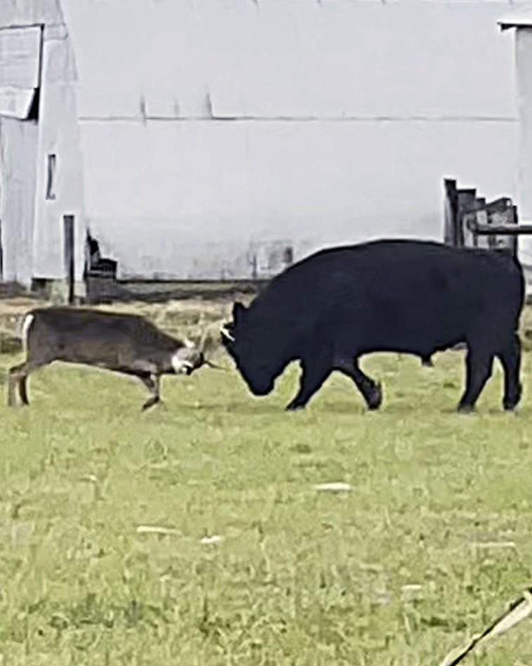 This isn’t the first time we’ve seen a buck going up against an animal of a different species (for example, click here to watch a video of a buck and a ram going head to head).However, in the case of buck vs. bull, the two animals are clearly in entirely different weight classes.