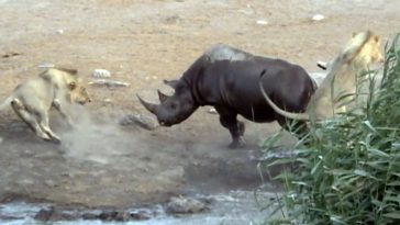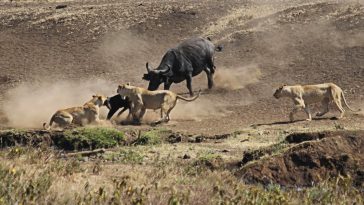 When a group of hungry lions encounters a buffalo and her young away from their herd, the opportunity for a quick lunch was too much to pass up. In this harrowing footage shot in Tanzania, the lions circle the buffalo, repeatedly charging the calf while the brave mom races back and forth to drive them […] More
