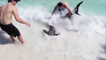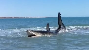 This powerful Orca demonstrates its amazing ability to surf the wave right onto the beach, nearly stranding itself on land in order to capture a baby seal. This particular beaching style of hunting often requires years of practice. Beaching can be very risky and possibly fatal for the cetacean if it gets too far onto the […] More