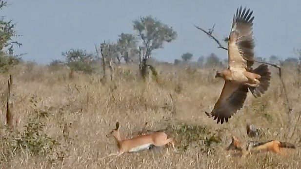 Incredible footage captures the moment an eagle and two jackals were filmed hunting the same antelope. The footage shows the massive eagle swooping down on the buck while jackals later are seen in hot pursuit. Watch: