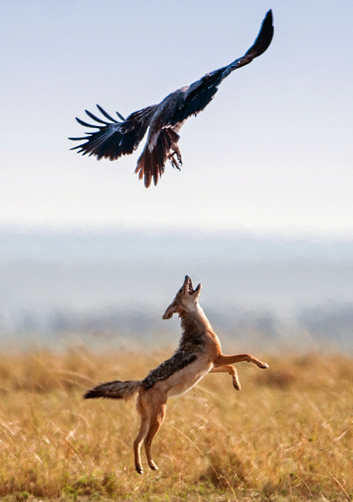 Go find your own food! This jackal had been preparing to tuck into a fresh kill when another fierce predator showed up: a hungry tawny eagle hell-bent on stealing its lunch.