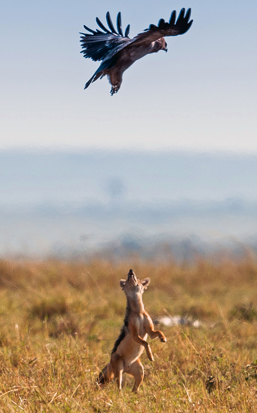 The eagle’s ability to soar effortlessly in mid-air keeps it safe as it taunts the jackal below.