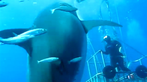 Understandably, the enormous animal gave the divers a bit of a scare when she began to curiously inspect the exterior of their diving cage.