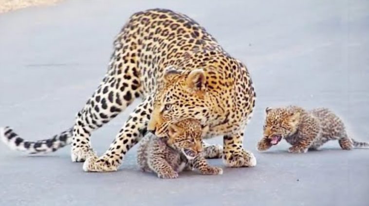 Watch the unbelievably cute moment filmed on camera when a leopard mother is seen helping her cute newborn Leopard cubs cross the road in the Kruger National Park. The heart-warming cuteness of these little ones is almost unbearable and all we can do is watch. When you get the opportunity to capture it on film, it makes the sighting even more special.