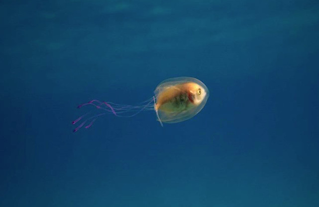 It looks like this fish has seen better days. It’s stuck inside a jellyfish.