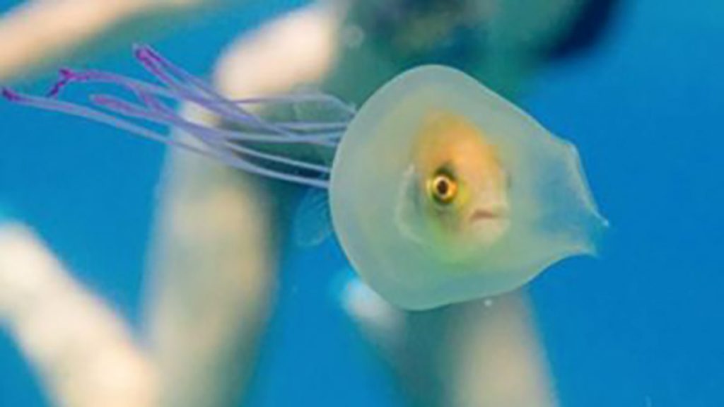 It turns out that the fish may have placed himself in this position on purpose. According to Ian Tibbetts, a marine biologist at the Centre for Marine Science at the University of Queensland, this fish appears to be a trevally — a species that commonly hides in the stingers of jellyfish as a form of protection against predators.