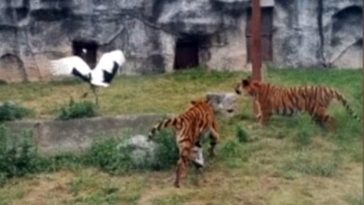 Crane Fearlessly Fights Off Two Tigers in Zoo