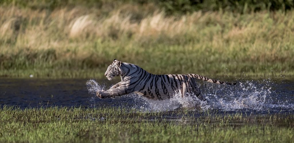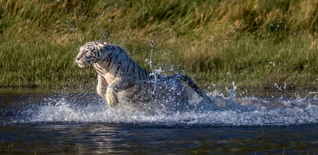 White tigers are an extremely rare sight!Only about one in every 10,000 wild tigers are born with leucism – which is a lack of pigment where the fur shows the distinctive white and black coats, and blue eyes.Two rare white tigers play in the water.Tigers are often described as being one of the few big cats that enjoys a good swim every now and then, along with jaguars.A stunning photo of a white tiger leaping out of the water.These tigers are clearly enjoying the water.White tigers are majestic!