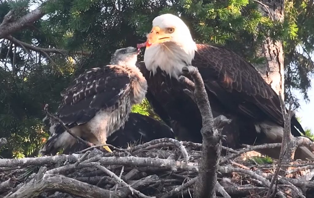 A red-tailed hawk chick that was “adopted” by bald eagles has survived against the odds.