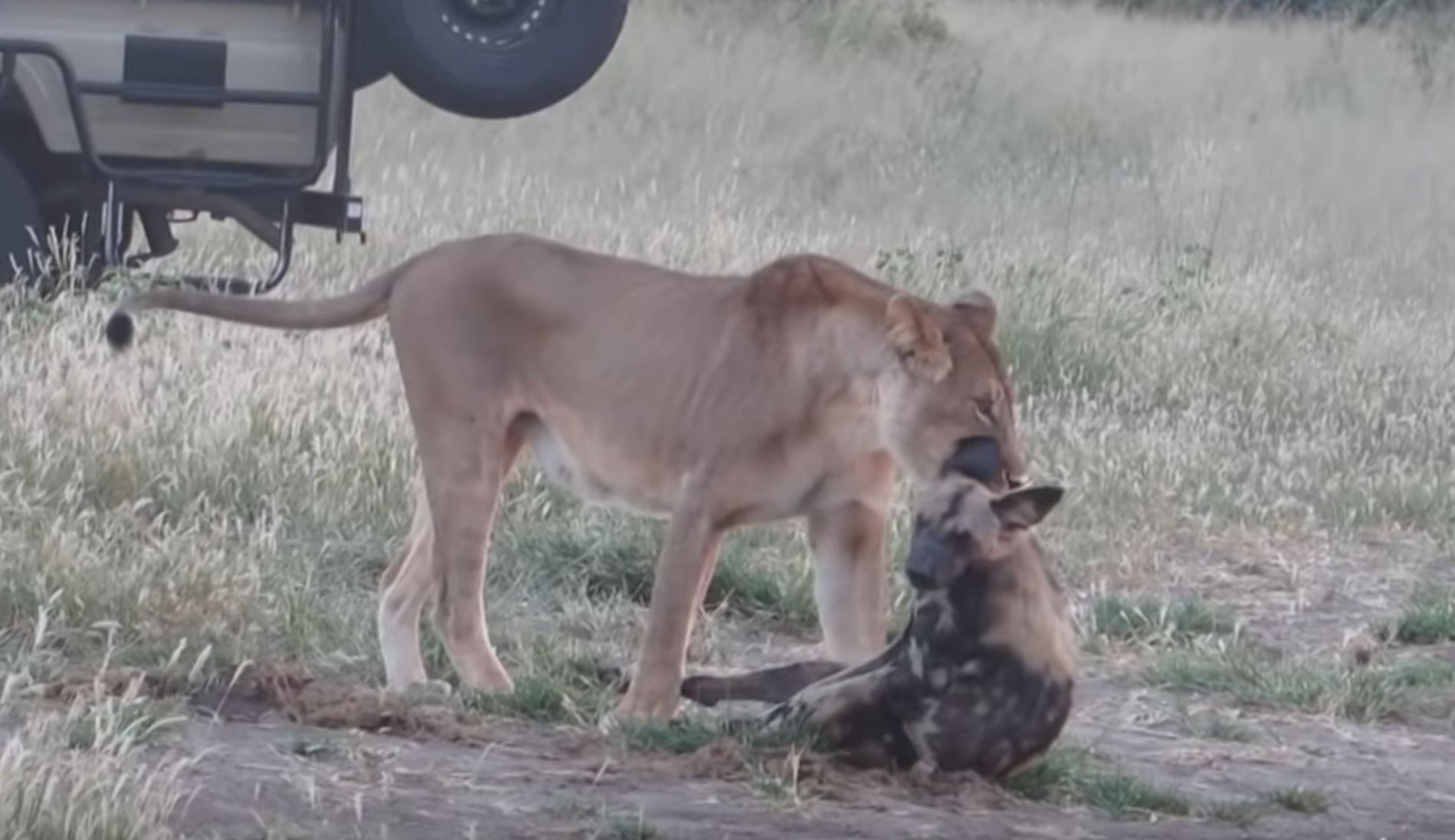 An African Bush Camp guide and his guests witnessed quite a spectacular event on a game drive in Hwange National Park, Zimbabwe: a wild dog playing dead to escape the jaws of a lioness.