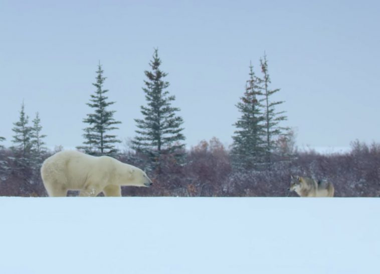 The team documented the hungry wolves circling the polar bear, cautiously gauging its reaction. The first minutes are intense; the bear does initially seem concerned about the approaching pack. Eventually, however, the bear realizes the pack of just three wolves is lacking in numbers — and it finally makes the move to chase them away.